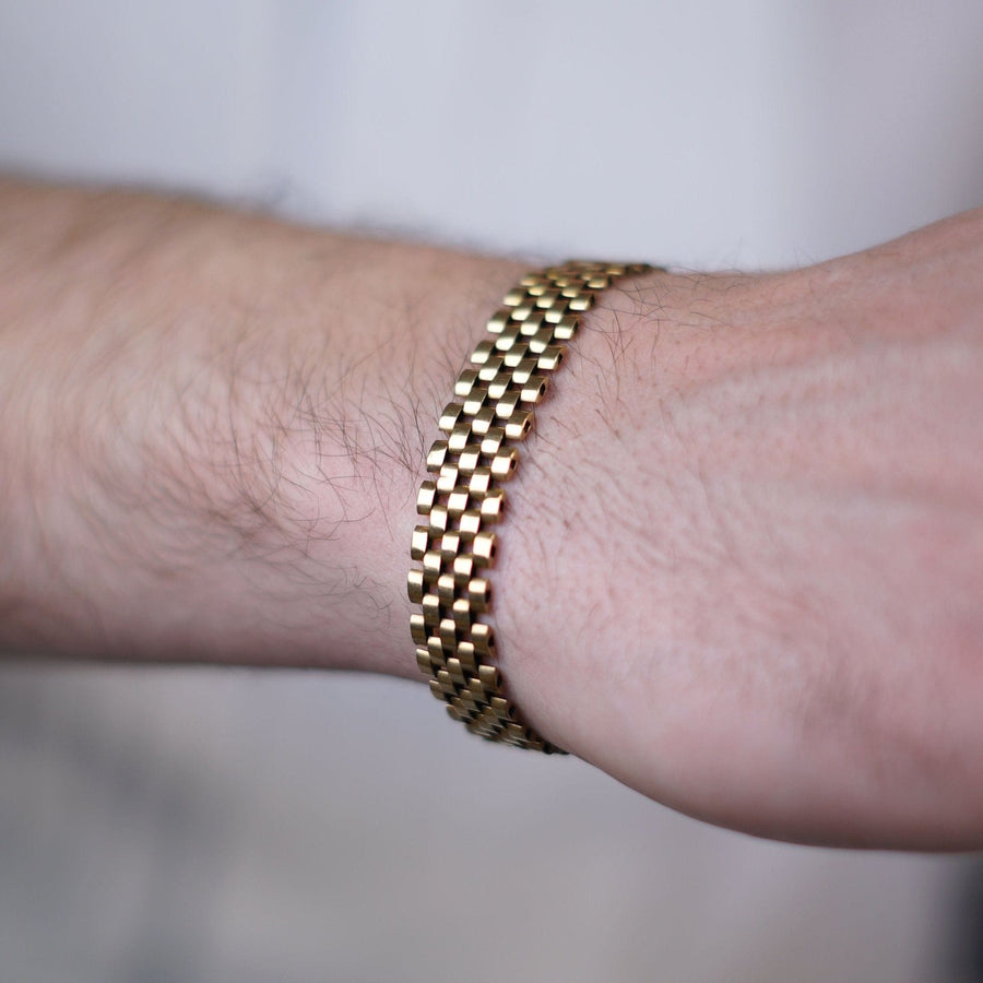 This is a retro looking bracelet that is timeless in its design, which is clearly influenced by Cartier's iconic "tank designs", which were first designed by Louis Cartier in 1917 and inspired by the new Renault tanks - the "machine age", which had become the height of fashion.